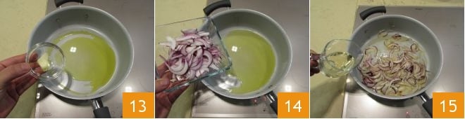 In einem antihaftbeschichteten Topf mit breitem Boden erhitzen Sie das Öl und braten eine geschälte ganze Knoblauchzehe an 13. Wenn sie goldbraun ist, entfernen Sie sie und geben die Zwiebel in den Topf 14. Löschen Sie mit Weißwein ab und lassen Sie die Zwiebel weich werden 15.