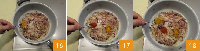 Wenn sie gut weich ist und die Flüssigkeit verdampft ist, fügen Sie das Kurkuma hinzu 16. Aromatisieren Sie auch mit Paprika 17 und Curry 18 (die Menge dieser Zutaten kann je nach Ihrem persönlichen Geschmack und der Intensität des Geschmacks der verwendeten Gewürze variiert werden).