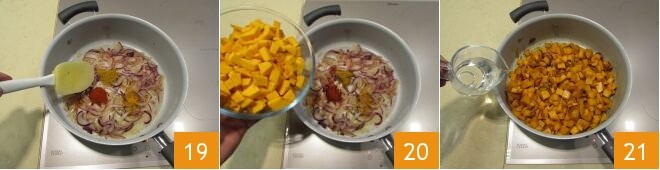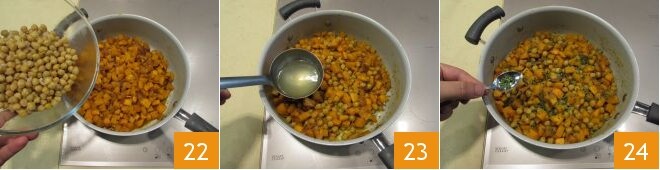 Rühren Sie die Zutaten gut um 19. An dieser Stelle fügen Sie den Kürbis hinzu: braten Sie ihn etwa 4 Minuten an 20, salzen und pfeffern und achten Sie darauf, ihn gut umzurühren, um zu verhindern, dass er am Boden des Topfes klebt. Dann gießen Sie Wasser hinzu, um das Kochen des Kürbisses zu fördern 21 und kochen Sie es bei schwacher Hitze etwa 7-8 Minuten weiter.