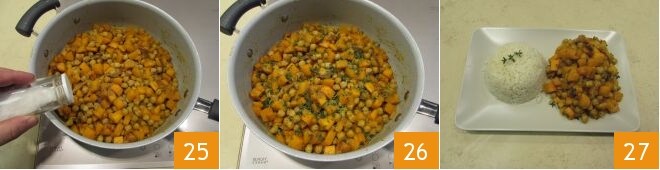 Salzen 25 und pfeffern: Kürbis und Kichererbsen sind nun fertig 26. Zu diesem Zeitpunkt können Sie Ihr vegetarisches Curry mit Kürbis und Kichererbsen anrichten: wenn Sie möchten, können Sie den Reis Pilaf in einweg-Aluminiumformen anrichten, um eine beeindruckende Präsentation zu erzielen 27!