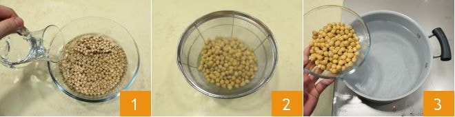 Um das vegetarische Curry zuzubereiten, beginnen Sie mit den Kichererbsen, indem Sie eine große Schüssel nehmen und sie in kaltem Wasser einweichen 1: lassen Sie sie mindestens über Nacht so stehen. Am nächsten Tag abtropfen lassen 2 und für etwa 1 Stunde/1 Stunde und 30 Minuten in einem großen Topf mit reichlich Wasser kochen (orientieren Sie sich an den Kochangaben auf der Packung der gekauften Kichererbsen) 3: sie sollten weich werden, ohne zu zerfallen.