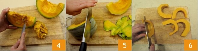 Während die Kichererbsen kochen, bereiten Sie die Gemüsebrühe zu und widmen sich dann der Zubereitung des Kürbisses: entfernen Sie die Kerne und die inneren Fasern 4, schneiden Sie die äußere Schale ab 5. Schneiden Sie ihn dann in nicht zu dicke Scheiben 6.