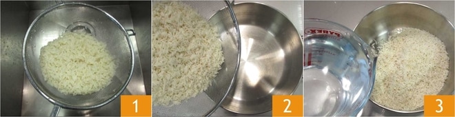 Um den Curryreis zuzubereiten, spülen Sie zuerst den Basmati-Reis unter fließendem Wasser ab 1, geben Sie ihn dann in einen Topf 2 zusammen mit Wasser 3 und Salz.