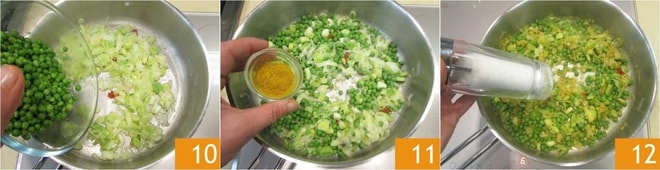 Fügen Sie die Erbsen 10 und das Currypulver 11 hinzu, gut vermischen und bei mittlerer Hitze 3-4 Minuten kochen, mit Salz abschmecken 12.