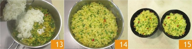 Nun fügen Sie den Reis hinzu 13, vermischen Sie alles gut und lassen Sie es noch 1-2 Minuten auf dem Herd 14. Ihr Curryreis ist servierfertig 15!