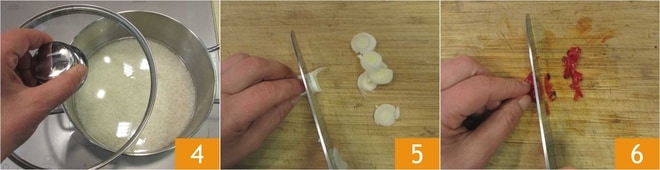 Decken Sie den Topf mit einem Deckel ab 4 und bringen Sie das Wasser zum Kochen. Wenn das Wasser zu kochen beginnt, reduzieren Sie die Hitze und kochen Sie den Reis etwa 8 Minuten. In der Zwischenzeit den Lauch putzen und in Ringe schneiden 5, dann die Chilischoten entkernen und fein hacken 6.