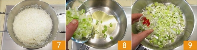 Der Reis ist nun fertig gekocht, also schalten Sie die Hitze aus und lassen Sie ihn 10 Minuten ruhen 7. In der Zwischenzeit erhitzen Sie das Öl in einer großen Pfanne, fügen Sie den Lauch 8 und die Chilischoten 9 hinzu und dünsten Sie alles bei schwacher Hitze etwa 5-6 Minuten.
