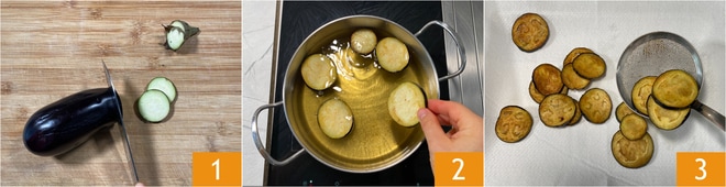 Um den Cuzzetiello alla Parmigiana zuzubereiten, schneiden Sie zuerst die Auberginen in Scheiben von 1-2 cm Dicke 1. Tupfen Sie sie gut ab und frittieren Sie sie in Erdnussöl 2 bei etwa 170°C für 2-3 Minuten. Frittieren Sie sie in kleinen Mengen, um die Temperatur des Öls nicht zu stark zu senken. Legen Sie sie dann auf Küchenpapier 3, um das überschüssige Öl zu entfernen, geben Sie eine Prise Salz hinzu und stellen Sie sie beiseite.