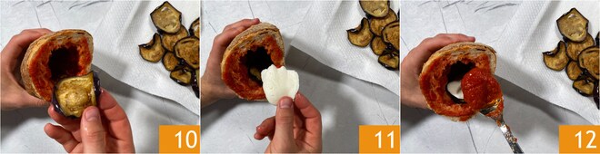 Fahren Sie fort mit einer Scheibe Aubergine 10, einer Scheibe Mozzarella 11 und weiterer Sauce 12.