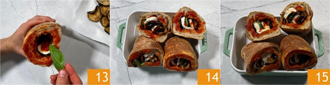 Vervollständigen Sie die erste Schicht mit einem Basilikumblatt 13. Machen Sie zwei weitere Schichten in derselben Reihenfolge, indem Sie die Cuzzetielli mit einer Scheibe Aubergine 14 abschließen und in eine Auflaufform legen. Backen Sie sie statisch bei 200°C für 5 Minuten. Ihr Cuzzetiello alla Parmigiana ist bereit, genossen zu werden 15!