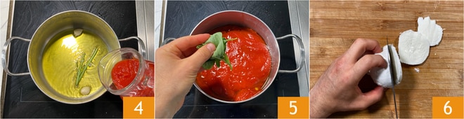 In einem Topf das Olivenöl erhitzen, die Basilikumstiele und die halbierten Knoblauchzehen hinzufügen und für ein paar Minuten anbraten. Fügen Sie die Passata 4, das Basilikum 5 hinzu, würzen Sie mit Salz und lassen Sie es bei mittlerer Hitze für etwa 30-40 Minuten kochen. Entfernen Sie am Ende des Kochens den Knoblauch und die Basilikumstiele. In der Zwischenzeit schneiden Sie die Mozzarella in Scheiben 6.