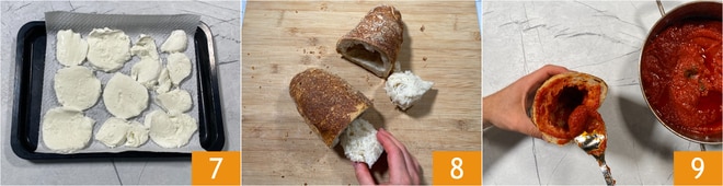 Lassen Sie sie auf Küchenpapier abtropfen 7. Schneiden Sie die Enden der Brote ab, um 4 Stücke von jeweils etwa 180 g zu erhalten, und höhlen Sie sie aus 8. Jetzt können Sie die cuzzetielli füllen, beginnend mit der Sauce 9.