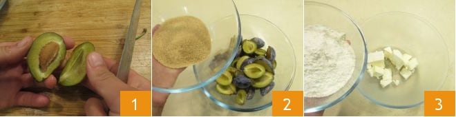 Um den Damson Cobbler zuzubereiten, wascht zuerst die Pflaumen, halbiert sie 1, entfernt den Kern und gebt sie in eine Schüssel. Fügt den braunen Zucker hinzu, mischt und stellt sie beiseite. Jetzt kümmert euch um den Streuselteig: In eine Schüssel gebt ihr die kalte Butter in Stücken, fügt das Mehl hinzu 3