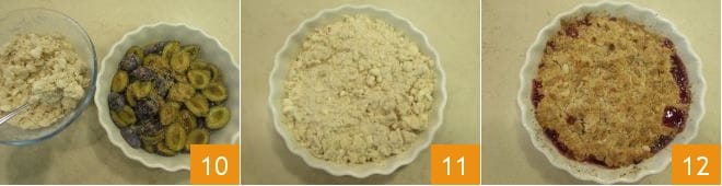 gebt die Pflaumen auf den Boden 10 und streut den Streuselteig darüber, sodass die Pflaumen vollständig bedeckt sind 11. Backt den Kuchen im vorgeheizten statischen Ofen bei 190°C für 55 Minuten. Nach dem Backen aus dem Ofen nehmen, abkühlen lassen und dann euren Damson Cobbler genießen 12!