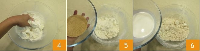 und knetet schnell mit den Händen 4, um einen krümeligen Teig zu erhalten. Fügt dann den braunen Zucker hinzu 5, mischt und gebt die Sahne dazu 6, mischt weiter, damit die Flüssigkeit aufgenommen wird.