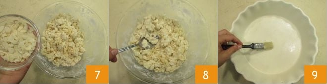 Zum Schluss fügt die Mandelblättchen hinzu 7, mischt ein letztes Mal, um alles zu verbinden 8. Die Mischung sollte ziemlich krümelig sein. Fettet eine Keramik-Tarteform mit einem Durchmesser von 26 cm ein 9,
