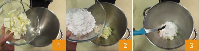 Um die dänischen Kekse zuzubereiten, beginnen Sie als erstes mit dem Teig. Geben Sie in die Schüssel einer Küchenmaschine mit Rührblatt die weiche Butter 1, den Puderzucker 2 und das Mark der Vanilleschote 3.
