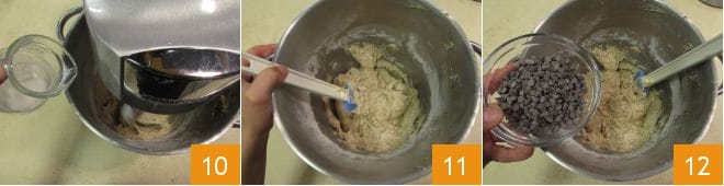 Gießen Sie die restliche Milch hinzu 10, lassen Sie es einziehen, bis Sie einen cremigen Teig erhalten 11. Fügen Sie die Schokoladenstückchen hinzu 12.