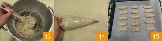 und mischen Sie weiter, um sie mit dem Rest zu verbinden 13. Geben Sie den Teig in einen Spritzbeutel mit einer glatten Tülle von 1 cm Durchmesser 14. Formen Sie die Kekse zu etwa 5 cm langen Stangen auf einem mit Backpapier ausgelegten Blech 15.