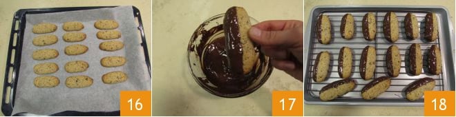 Backen Sie die Kekse im statischen Ofen bei 180° für 20 Minuten. Nehmen Sie die Kekse aus dem Ofen 16, lassen Sie sie abkühlen, und wenn sie vollständig kalt sind, können Sie einige dekorieren, indem Sie sie nur zur Hälfte in temperierte Zartbitterschokolade tauchen 17. Sie können sie auf der langen oder kurzen Seite oder schräg eintauchen. Während Sie die Kekse in die Schokolade tauchen, entfernen Sie den Überschuss am Rand der Schüssel und platzieren Sie sie auf einem mit Backpapier ausgelegten Tablett oder einem Gitter 18. Lassen Sie die Schokolade an einem kühlen Ort fest werden und genießen Sie sie!