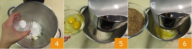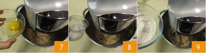 Fügen Sie auch das Salz hinzu 4. Starten Sie die Maschine auf niedriger Geschwindigkeit, dann erhöhen Sie die Geschwindigkeit, wenn die Zutaten anfangen, sich zu verbinden, bis Sie eine schaumige Masse erhalten. Fügen Sie ein Ei hinzu 5, lassen Sie es einziehen und fügen Sie etwas Haselnussmehl hinzu 6.