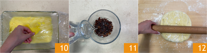 Die fertige Creme in eine flache und breite Auflaufform geben, sofort mit Frischhaltefolie abdecken 10 und vollständig abkühlen lassen. Sie können die Rosinen abspülen und einweichen lassen 11, während Sie den Teig auf einer leicht bemehlten Arbeitsfläche ausrollen 12.