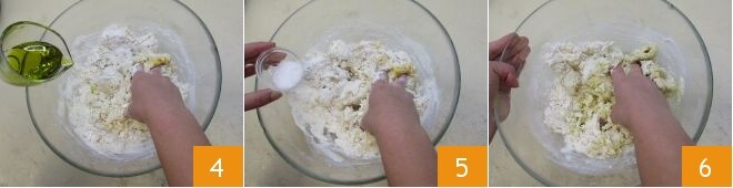 Fügen Sie das Öl hinzu 4 und schließlich das Salz 5 und mischen Sie die Zutaten weiter, bis sie sich verbunden haben 6.