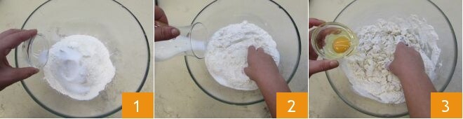 Um die vegetarische Donau zuzubereiten, beginnen Sie mit der Herstellung des Teigs. In einer Schüssel geben Sie das Mehl (verwenden Sie Manitoba-Mehl oder Typ 0) zusammen mit dem Zucker und dem Trockenhefe 1. Während Sie kneten, gießen Sie langsam die lauwarme Milch dazu 2 und dann das Ei 3.