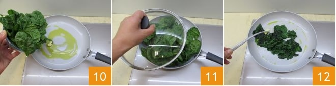 In der Zwischenzeit kümmern Sie sich um die Füllungen. In einer Pfanne erhitzen Sie etwas Öl zusammen mit dem Knoblauch und wenn es heiß ist, fügen Sie den Spinat hinzu 10, decken Sie die Pfanne mit einem Deckel ab 11 und kochen Sie bei starker Hitze nur wenige Minuten, bis die Blätter verwelkt sind. Wenn der Spinat erweicht ist, salzen und den Knoblauch entfernen 12