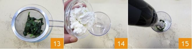 und lassen Sie ihn dann abkühlen und das überschüssige Wasser abtropfen, indem Sie ihn in ein Sieb in einer Schüssel legen 13. Geben Sie anschließend den Ricotta in einen Standmixer 14, fügen Sie den Spinat hinzu und pürieren Sie ihn 15