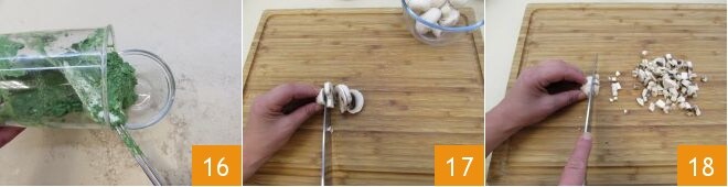 bis Sie eine glatte und homogene Creme erhalten, die Sie in eine Schüssel geben und beiseite stellen können 16. Gehen Sie zu den Pilzen über, nachdem Sie sie schnell unter Wasser abgespült haben, entfernen Sie den unteren Teil und schneiden Sie sie in Scheiben 17, um sie dann in Würfel zu schneiden 18.