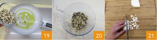 Geben Sie die gerade gewürfelten Stücke in eine Pfanne mit etwas Öl und lassen Sie sie einige Minuten kochen, würzen Sie mit Salz und Pfeffer 19; nach dem Kochen lassen Sie sie in einer Schüssel abkühlen 20. Schneiden Sie sowohl den Käse als auch die getrockneten Tomaten in kleine Würfel 21