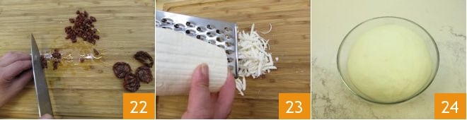 und den in Öl eingelegten getrockneten Tomaten 22. Reiben Sie auch den gesalzenen Ricotta 23 und nehmen Sie den Teig der Donau zurück, der mittlerweile gut aufgegangen und damit im Volumen verdoppelt ist 24.