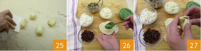 Teilen Sie den Teig in 27 kleine Kugeln 25, flachen Sie sie mit den Fingern oder einem Nudelholz ab und beginnen Sie, die 3 Füllungen abwechselnd in die Mitte zu geben. Geben Sie also in die Mitte eines Scheibchens etwas pürierten Spinat mit Ricotta 26 und schließen Sie durch Kneifen der Enden mit den Fingern, darauf achten, dass es keine offenen Stellen gibt, aus denen die Füllung austreten könnte 27