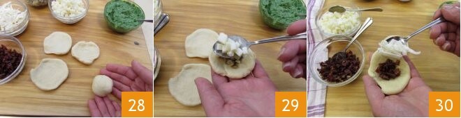 und schließlich runden Sie ab, bis Sie eine Kugel formen 28. Wiederholen Sie das gleiche Verfahren mit den anderen Zutaten, also mit den Pilzen und gewürfeltem Käse 29 und dann mit getrockneten Tomaten und gesalzenem Ricotta 30