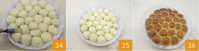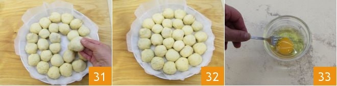 Legen Sie ein rundes Backblech mit einem Durchmesser von 32 cm mit Backpapier aus und legen Sie die gefüllten Kugeln eins nach dem anderen hinein 31, indem Sie die verschiedenen Geschmäcker abwechseln. Es ist wichtig, dass die Naht der Kugel nach unten zeigt, damit sich die Kugeln während des Kochens nicht öffnen. Decken Sie die Donau mit Frischhaltefolie ab und lassen Sie sie etwa eine Stunde bei Raumtemperatur gehen 32. Wenn sie wieder aufgegangen ist, schlagen Sie ein Ei auf und verquirlen es leicht mit einer Gabel 33.