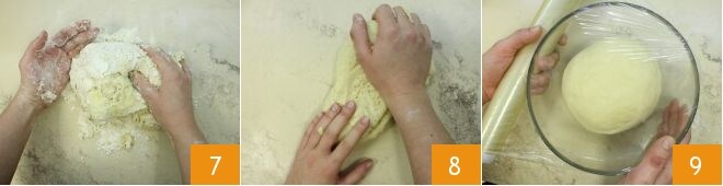 Zu diesem Zeitpunkt legen Sie den Teig auf das Nudelbrett und kneten ihn mit den Händen 7: Strecken Sie den Teig aus und wickeln Sie ihn dann wieder ein und wiederholen Sie dies etwa zehn Minuten lang 8, auf diese Weise wird Luft eingeschlossen und der Teig erwärmt. Formen Sie schließlich eine Kugel und legen Sie sie in eine Schüssel, die Sie mit Folie abdecken, und lassen Sie sie 3-4 Stunden im ausgeschalteten Ofen mit eingeschaltetem Licht gehen 9.