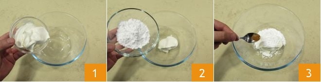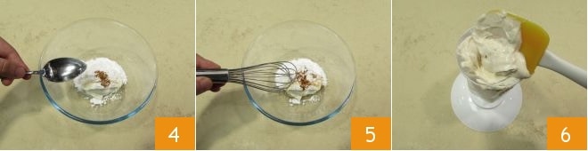 Um die Datteln gefüllt mit Mascarpone und Walnüssen zuzubereiten, beginnt ihr damit, den Mascarpone 1 und den Puderzucker 2 in eine große Schüssel zu geben. Mit Zimt 3 aromatisieren.