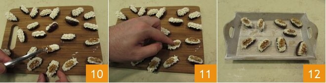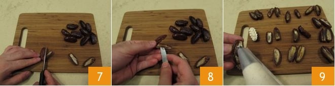 Stellt den Spritzbeutel beiseite, während ihr die Datteln vorbereitet. Schneidet sie zunächst der Länge nach in zwei Hälften 7: Führt den Vorgang für alle Datteln durch. Entfernt dann die Kerne 8: So erhaltet ihr Datteln in Form eines kleinen Bootes, die bereit zum Füllen sind. Nehmt den Spritzbeutel und beginnt, die Datteln in der Vertiefung zu füllen 9.