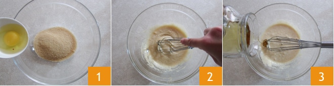 Um den Dinkel- und Erdbeerkuchen zuzubereiten, geben Sie in eine Schüssel den Zucker und das Ei 1. Mit einem Schneebesen verrühren, bis eine cremige Masse entsteht 2. Unter weiterem Rühren das Öl in einem dünnen Strahl zugeben 3.