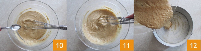 eine Prise Salz 10 und gut mit dem Schneebesen weiterrühren 11. Eine Springform von 22 cm Durchmesser einfetten und bemehlen, dann die Masse hineingießen 12.
