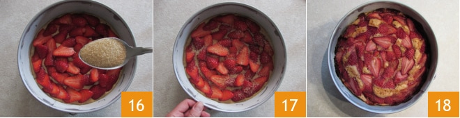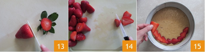 Die Erdbeeren gut säubern, den Teil mit den Blättern entfernen und etwa einen halben cm dicke Scheiben schneiden 14. Die Oberfläche des Kuchens dekorieren, indem die Erdbeeren strahlenförmig angeordnet werden 15
