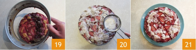 Sobald der Kuchen kalt ist, aus der Form nehmen 19, mit Puderzucker dekorieren 20 und servieren 21!