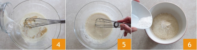 Wenn es gut eingearbeitet ist, fügen Sie auch die Mandelmilch hinzu 4, dabei weiterhin rühren 5. In einer anderen Schüssel das Dinkelmehl und das Backpulver geben 6.