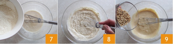 Die trockenen Zutaten zu der zuvor vorbereiteten Mischung geben 7 und erneut mit dem Schneebesen rühren 8, bis eine glatte und homogene Masse entsteht. Den Haselnusskrokant hinzufügen 9,