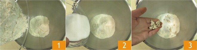Um die Donuts zuzubereiten, erwärmen Sie zunächst leicht die Milch, die Sie für die Zubereitung des Teigs benötigen. In der Zwischenzeit geben Sie in die Schüssel einer Küchenmaschine mit Haken das Mehl 00 und das Manitoba-Mehl 1, zusammen mit dem Zucker 2 und der zerbröckelten Hefe 3.