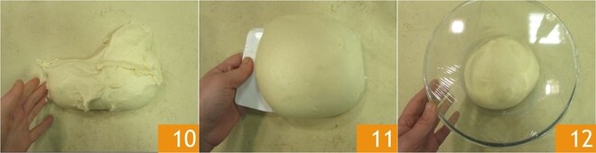 Trennen Sie den Teig vom Haken mit leicht angefeuchteten Händen, dann helfen Sie sich mit einem Teigschaber, um ihn auf die Arbeitsfläche zu legen 10. Bestäuben Sie ihn mit ein wenig Mehl und formen Sie den Teig zu einer Kugel, ebenfalls unter Verwendung des Teigschabers, um ihn leichter zu handhaben 11. Legen Sie ihn in eine große, zuvor gebutterte Schüssel, decken Sie ihn mit Frischhaltefolie ab 12 und lassen Sie ihn 2 Stunden im ausgeschalteten Ofen mit eingeschaltetem Licht ruhen.