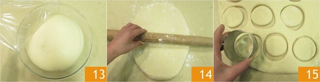 Nach der Gehzeit 13 legen Sie den Teig erneut auf die leicht bemehlte Arbeitsfläche und rollen ihn mit einem Nudelholz auf eine Dicke von 1 cm aus 14, dann schneiden Sie Kreise mit einem 8 cm Durchmesser Ausstecher aus 15.