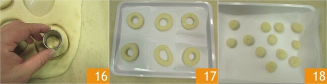 Holen Sie die Löcher der Donuts mit einem kleineren Ausstecher, mit einem Durchmesser von 3 cm 16. Legen Sie die entstandenen Donuts auf etwa 10 cm große Pergamentpapierquadrate, die auf einem Tablett platziert werden 17; legen Sie auch die Teigreste auf ein mit Pergamentpapier ausgelegtes Tablett 18. Decken Sie die Tabletts mit einem Geschirrtuch ab und lassen Sie sie 40 Minuten fern von Zugluft gehen.