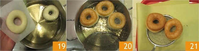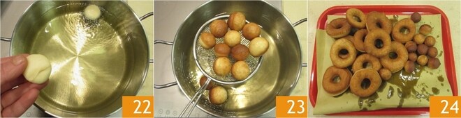 Tauchen Sie auch die Teigreste ins Öl 22 und frittieren Sie sie, um die berühmten Donut-Löcher 23 zu erhalten. Während die Donuts abkühlen 24, können Sie sich der Glasur widmen.